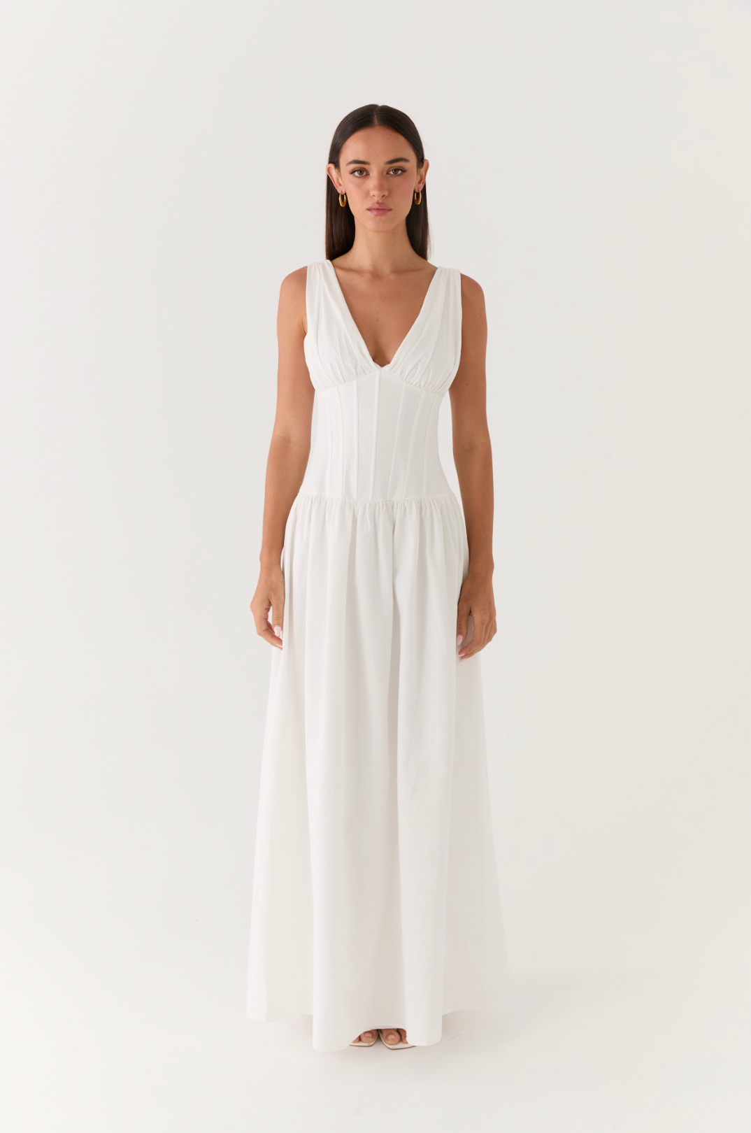 The Eunbi Maxi Dress features a structured v - neckline, specialised boning at the waist, and a dramatic drop waist skirt. This tight - fitting silhouette flows into a wide floaty hem, creating a sophisticated maxi length.