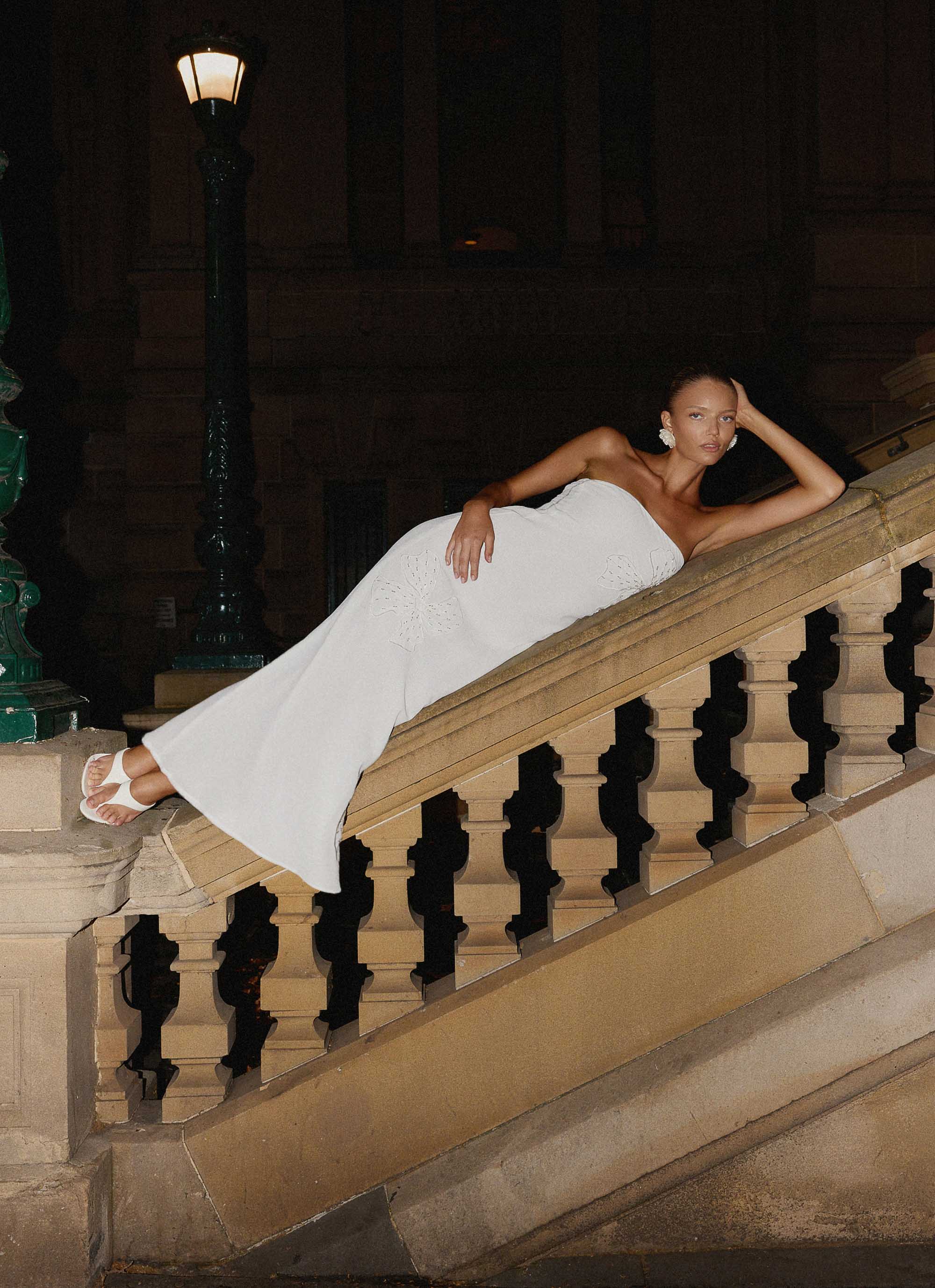 Peppermayo Exclusive - Sassafras Beaded Flower Strapless Maxi Dress - White